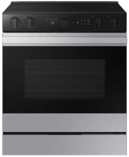 Samsung BESPOKE NSE6DG8700SR 30-inch slide-in electric range delivers professional-grade cooking with a 6.3 cu. ft. Convection+ oven for even heat distribution and superior baking results. Five elements including Express Boil™ technology accelerate cooking times, while the warming zone keeps dishes at serving temperature. Air fry capability provides healthier meal options without traditional deep frying. Dual self-cleaning and steam clean functions simplify maintenance. The integrated storage drawer maximizes kitchen organization, and ADA compliance ensures accessibility for all users. Stainless steel construction resists fingerprints and complements modern kitchens.