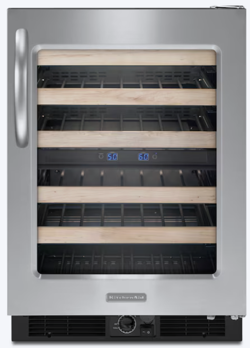# KitchenAid Black-on-stainless Dual Zone Cooling Undercounter Wine Chiller KUWS24RSBS Preserve your wine collection with precision temperature control. This undercounter wine chiller features dual independent cooling zones, allowing you to store red and white wines at their ideal temperatures simultaneously. The stainless steel construction with black accents complements modern kitchens while the compact undercounter design maximizes space efficiency. LED lighting showcases your bottles, and the vibration-dampening system protects delicate wines from disturbance. Perfect for serious collectors and entertaining enthusiasts who demand professional-grade wine storage in a residential setting.